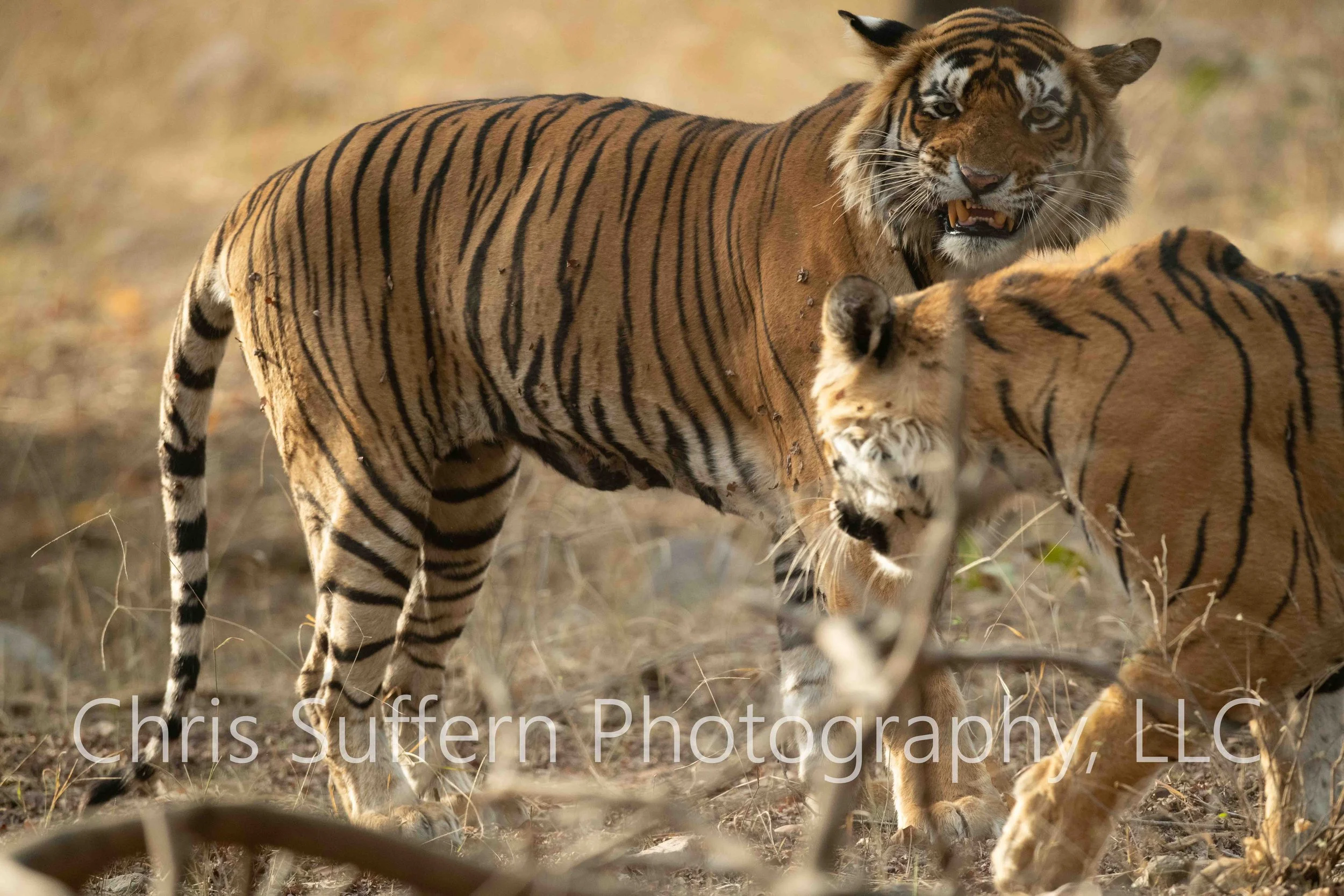 Early in the morning I met my guides, Ikram and his apprentice, Trilok. He was full of energy and excitement as his heavy words rushed into one another like a herd of water buffalo rushing to the feeding trough. Speaking and driving was fast. My kid remarked that the safari jeep was like a thrill ride at Tokyo Dome City. Bumps, sudden changes in speed and direction kept her holding on tightly to the jeep in efforts not to be flung into the dense dry forest. Within minutes of entering zone 2 I spotted two tigers resting under several trees, T120, a big 660lb male, and Arrowhead, his mate the previous day. We were first to arrive and my elation of finally being in the presence of one of the most magnificent large predators propelled me to quickly fire off some shots just for the sake of capturing my 4th panthera. Composition and video was to follow, but my initial high quality shots were enough to consider this trip successful. Roaring, mating, marking territory is what was observed during the following hours. Ikram knew better than I and encouraged to continue looking for others as he had caught word of a mother and cubs sighted in zone 10.