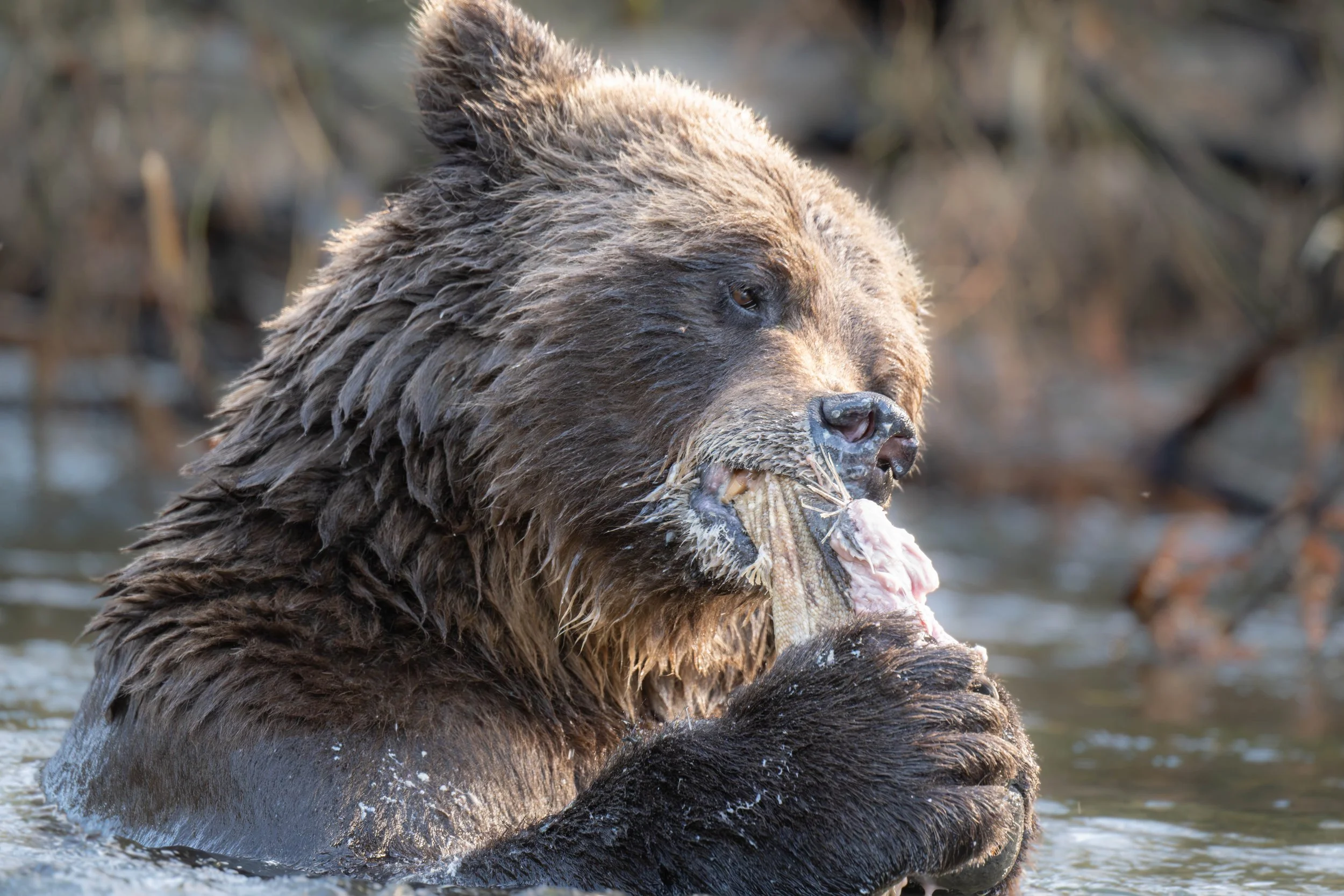 The lodge organized boat excursions to various river systems. The mainland destinations hosted ecosystems suitable for grizzlies while Kermode bears inhabited the western islands. The grizzly estuaries were overrun with rapidly maturing or dead salmon. Spawning season coming to an end is what drew the bears from higher ground. Often mothers with cubs were seen fishing. The cubs, in between jostling and jousting, would tussle over the most desired bits. Observing the feasting illustrated the bear’s preferences; Some preferred only the roe, others devoured the whole fish, while some preferred brains and skin. The pickier the safer as the salmon often have parasites. Their powerful sense of smell can detect the salmon with tapeworms thus avoid any potential morbidity. At one point, while cruising along in a zodiac, we found a mom and two cubs within 3-4 meters relentlessly devouring salmon. Cranium crushing, skin slicing, roe rummaging, and brain suckling created quite a spectacle. It was my daughter’s birthday which, I think, will leave a lasting impression and remain embedded in her memory.